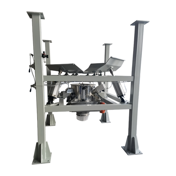 噸包解袋站吊帶裝置可平穩(wěn)地將噸袋吊起,放置于噸袋支撐板上,過渡料倉(cāng)上的氣動(dòng)夾帶裝置由氣缸控制打開,人工將袋口放置于夾帶裝置內(nèi),氣缸關(guān)閉壓緊袋口,然后解開繩子,物料從袋內(nèi)下料至過渡倉(cāng),由過渡倉(cāng)通過柔性螺旋上料機(jī)上料到稱重斗。獨(dú)特的框架設(shè)計(jì)會(huì)有多個(gè)高度可以調(diào)節(jié)以適應(yīng)不同尺寸的噸袋。采用氣動(dòng)手柄控制,穩(wěn)定、安全。